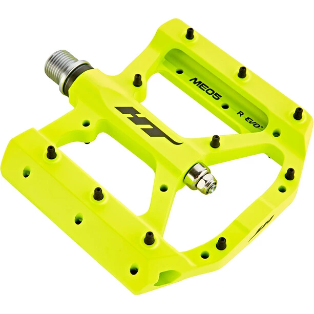 Les pédales HT Evo-Mag ME05 offrent la combinaison rarement atteinte que tous les fans de pédales plates veulent. Le Mag-Evo ME05 combine un corps en magnésium minimalement plat avec une plate-forme agréablement concave et 10 axes interchangeables pour créer une pédale qui donne l’impression que votre pied fait partie intégrante du vélo. Pour qu’une telle pédale soit possible, les composants HT s’enfoncent profondément dans le sac des tours. L’axe en titane rigide a une forme fortement conique et, contrairement à la plupart des autres pédales, est contré de l’extérieur. Cela permet également un entretien rapide des roulements ou leur remplacement en cas de besoin.