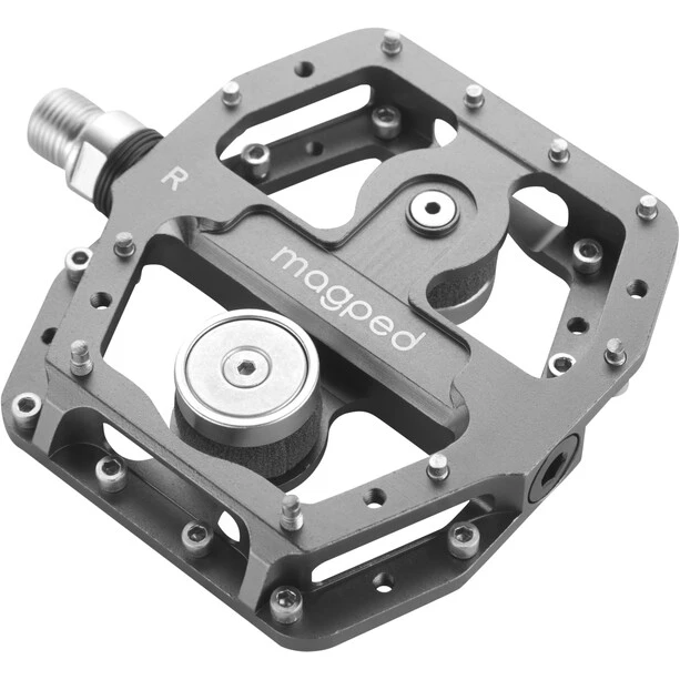 La pédale de magped est équipée de 3 roulements à billes industriels étanches de haute qualité. Les broches de la pédale peuvent être changées si nécessaire. La hauteur de l’aimant haute performance en néodyme est réglable grâce à une suspension polymère intégrée spéciale.